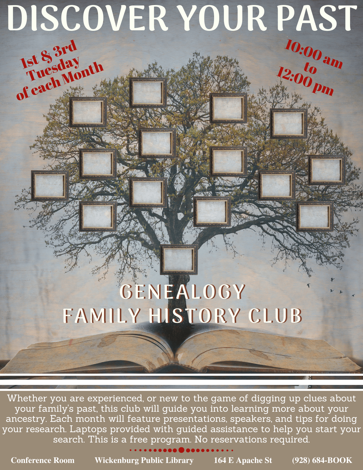 Our free, Family History Club, meets the 1st and 3rd Tuesday of every month from 10:00am to 12:00 pm at the library.